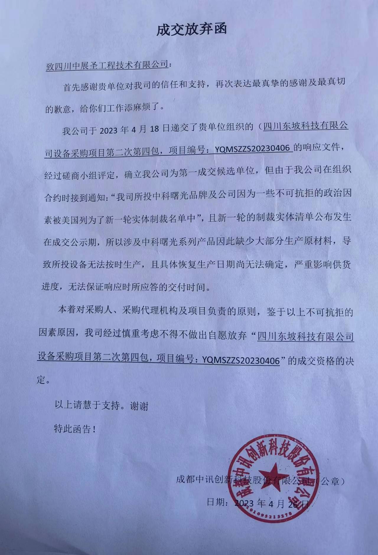 附件:原成交供应商成都中讯创新科技股份有限公司成交放弃函